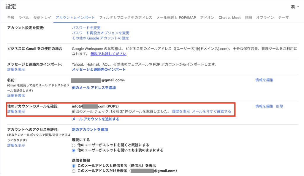 ・Gmail以外のメールアドレス(プロバイダのメールなど)を「POP」機能で取り込んでいる