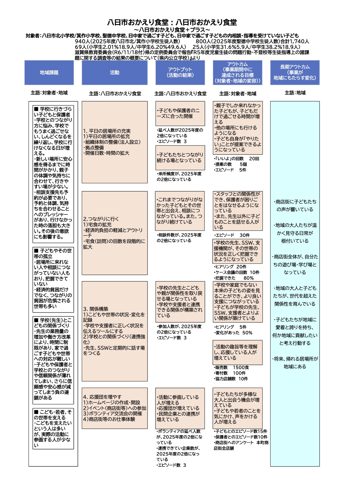 | 1.平日の居場所の拡充 | 学校に行きづらい子どもや若者のための平日の居場所(八日市おかえり食堂+プラス)の開催日時を週1から週3に順次拡大して、居場所に来るのべ人数や来所頻度が2倍になることをめざします。 |